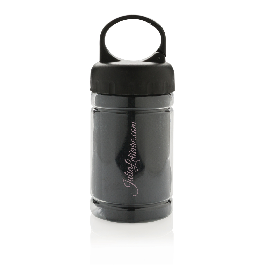 Mikrofaser Kühlhandtuch ( ca. 77x30cm) mit 98% Sun-Blocker-Funktion bis zu UV50+. Einfach etwas kühles Wasser zum Handtuch in die Dose geben und fertig ist die Erfrischung. Die Dose aus PP, der Deckel aus ABS und das ganze mit einem Karabiner, um sie bei allen Outdoor-Aktivitäten immer dabei zu haben.