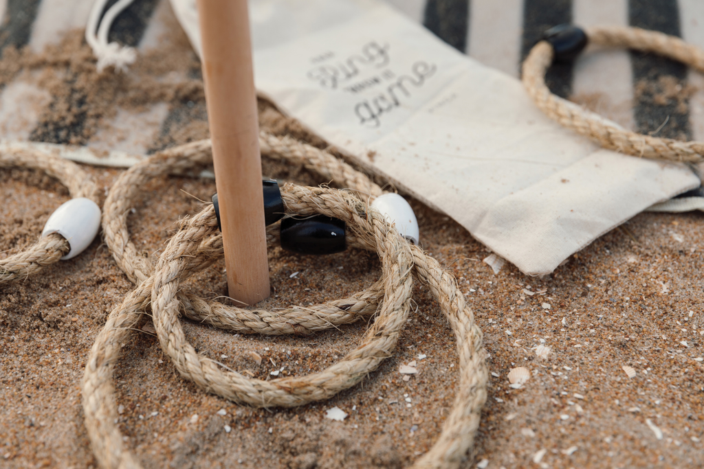 Ein Outdoor-Spiel, das am Strand genauso gut funktioniert wie im Park, verpackt in einer Baumwolltasche mit Netzrückseite, die es leicht zu transportieren macht. Das Spiel besteht darin, Seile in Form von Kreisen auf einen Stock zu werfen, den Sie einfach am Boden befestigen. Die unterschiedlichen Größen der Ringe geben unterschiedliche Punktzahlen. Eine vollständige Bedienungsanleitung ist enthalten.