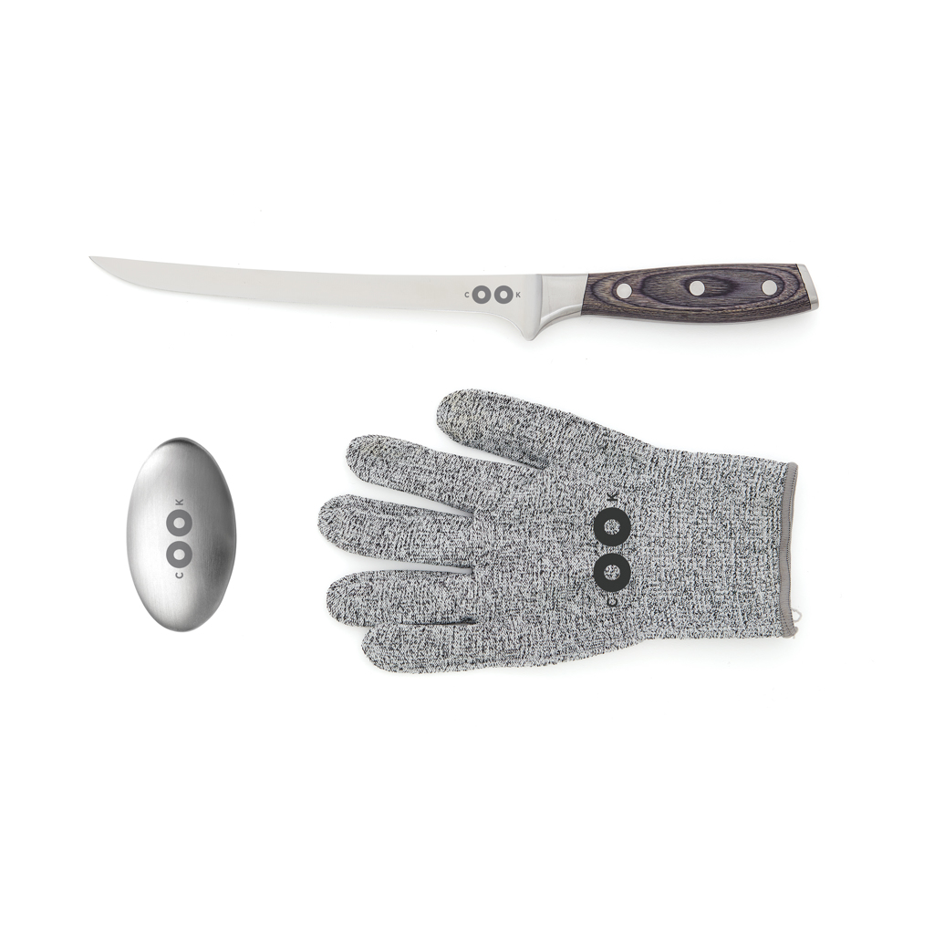 Das Set besteht aus einem Filetiermesser, einem stahlgewebten Handschuh und einer Metallseife. Der Handschuh hilft dabei, den rutschigen Fisch besser zu halten und schützt vor eventuellen Verletzungen. Die Metallseife entfernt Fisch- und Zwiebelgerüche, was gewöhnliche Seife nicht schafft. Die Klinge besteht aus deutschem X50CrMoV15 Stahl und der Griff ist aus Pakkaholz. Der Griff ist ergonomisch und durch die ausbalancierte Masse von Griff und Klinge ist das Messer bequem und einfach zu handhaben.
