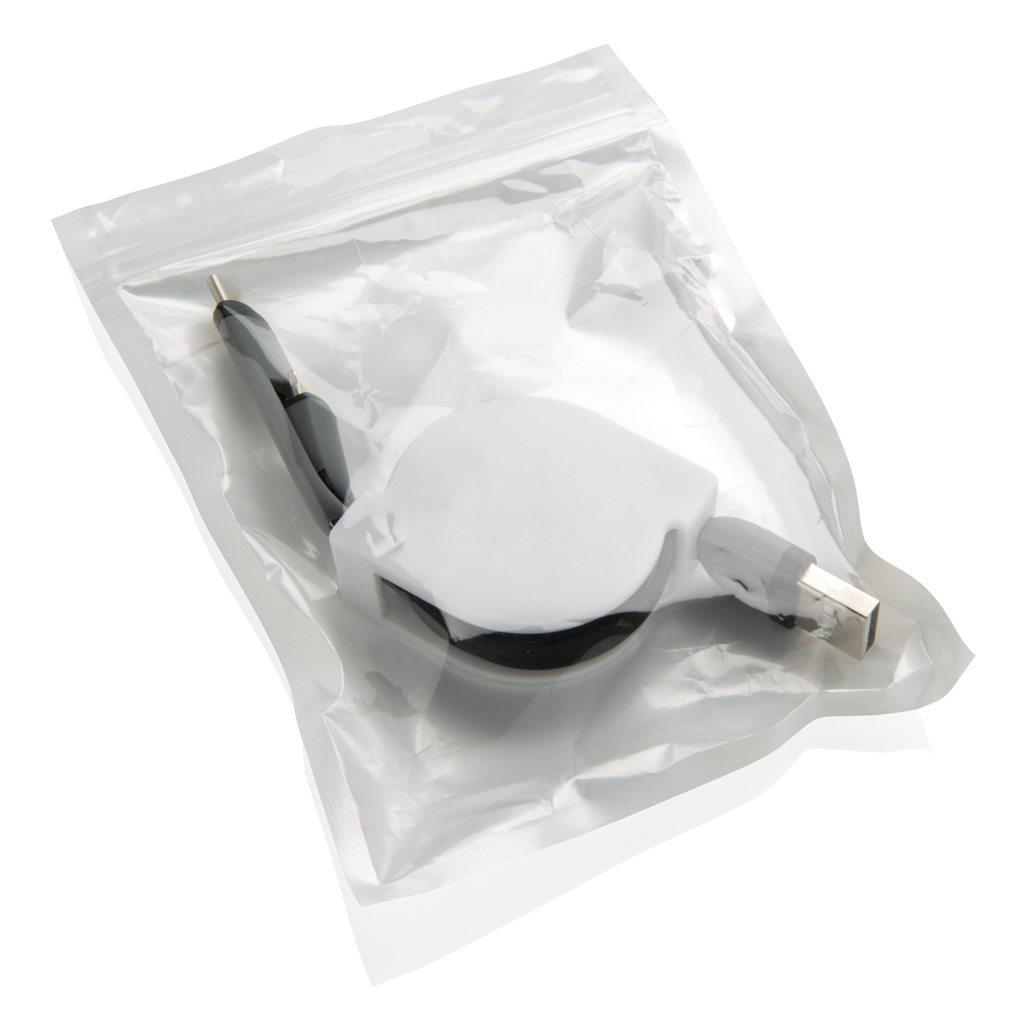 Kompaktes und ausziehbares 3-in-1 Ladekabel mit Type-C USB und zweiseitigem Anschlußstecker für iOS und Android Geräte, die einen Micro-USB Anschluß benötigen. Durch den Aufrollmechanismus kann das 100 cm Kabel, das auch zur Synchronisation Ihrer Daten verwendet werden kann, ohne jeglichen Kabelsalat überall hin mitgenommen werden. ABS-Gehäuse und TPU-Kabel.