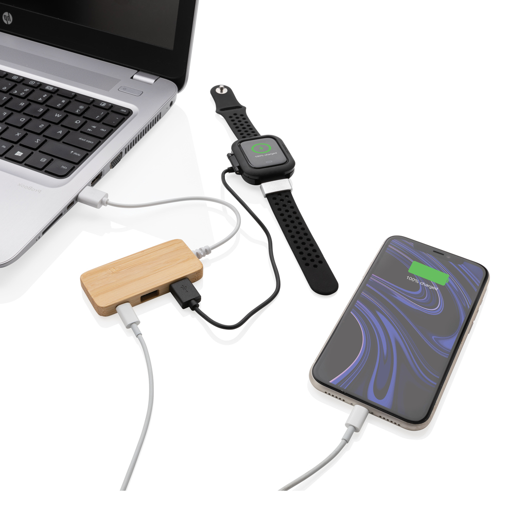 Dieser Bambus USB 2.0 Hub hat 2 USB A-Anschlüsse und einen Typ C-Anschluss zum Erweitern der USB-Anschlüsse Ihres Computers. Mit integriertem PVC-freiem TPE-Kabel.
