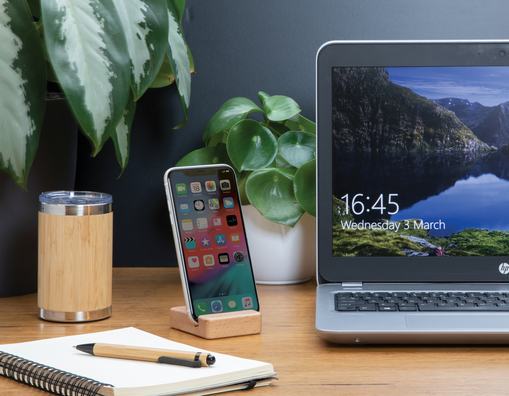 Der Telefonständer komplett aus natürlichem Bambus passt perfekt auf Ihren Schreibtisch, egal ob im Büro oder in Ihrem Home-Office.