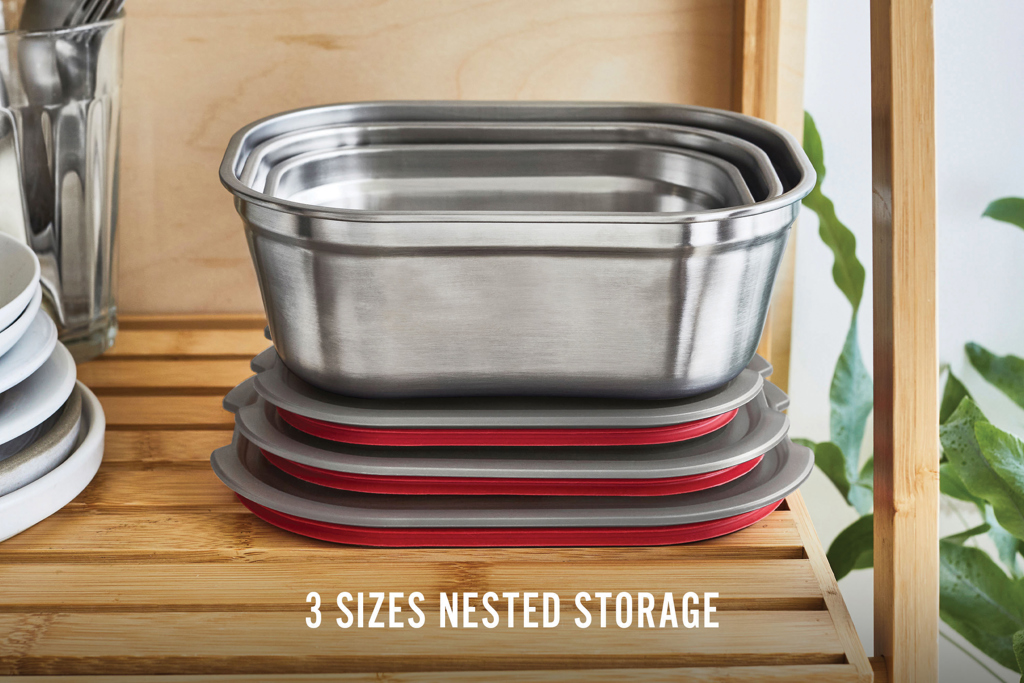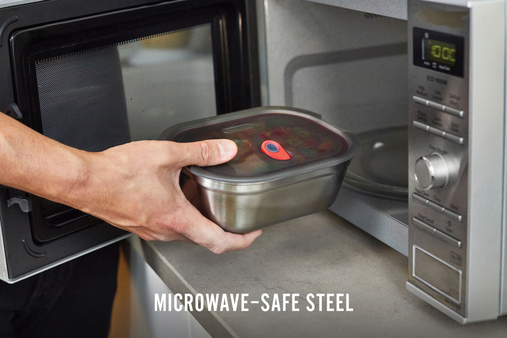 Ob für Frühstück, Mittagessen oder Snacks, die drei Edelstahl-Vorratsbehälter eignen sich ideal zur Aufbewahrung von Lebensmitteln, für das Mittagessen unterwegs oder für Gerichte, die direkt aus dem Ofen kommen. Jeder Behälter besteht aus einer mikrowellengeeigneten Stahlkonstruktion mit einem vakuumversiegelten, auslaufsicheren Deckel. Durch den halbtransparenten Deckel sehen Sie auf einen Blick, was sich darin befindet, während der hochwertige Edelstahlboden spülmaschinen-, gefrier- und ofenfest ist (Deckel nicht ofenfest). Die abnehmbaren Dichtungen ermöglichen eine mühelose Reinigung. Dank der einzigartigen Belüftungsöffnung im Deckel können Sie Ihre Speisen in der Mikrowelle erhitzen, ohne den Deckel abzunehmen, dies verkürzt die Aufheizzeit und verhindert Spritzer. Die BPA-freien Behälter lassen sich zur kompakten Aufbewahrung ineinander stapeln oder bei gleicher Größe übereinanderstapeln. Ein nachträglicher Druck hält einer Spülmaschine natürlich nicht lange Stand.