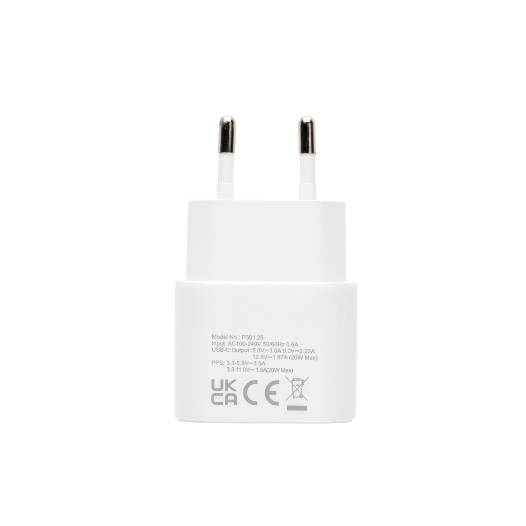 2-teiliges 20W Schnellladeset für mobile Geräte und andere Kleingeräte. Mit EU-Adapter mit 20W-USB-C-Anschluss und 120cm recyceltem TPE 20W-Schnellladekabel (USB-C zu USB /Lightning). Das Kabel unterstützt die Datenübertragung und auch das Aufladen größerer Geräte wie Laptops. Adapter und Kabel sind aus RCS-zertifiziert recyceltem PC, ABS und recyceltem TPE hergestellt. Verpackt in einem Beutel aus RCS-zertifiziertem, recyceltem PET. Recycelter Gesamtanteil des gesamten Sets: 59%, bezogen auf das Gesamtgewicht des Artikels. Die RCS-Zertifizierung gewährleistet eine vollständig zertifizierte Lieferkette der recycelten Materialien. Verpackt in FSC®-Verpackung. PVC-frei. Input Wandladegerät AC 100-240V 50/60Hz 0,6A; Output Wandladegerät USB-C: 5,0V⎓3,0A,9,0V⎓2,22,12,0V⎓1,67A (20W Max);