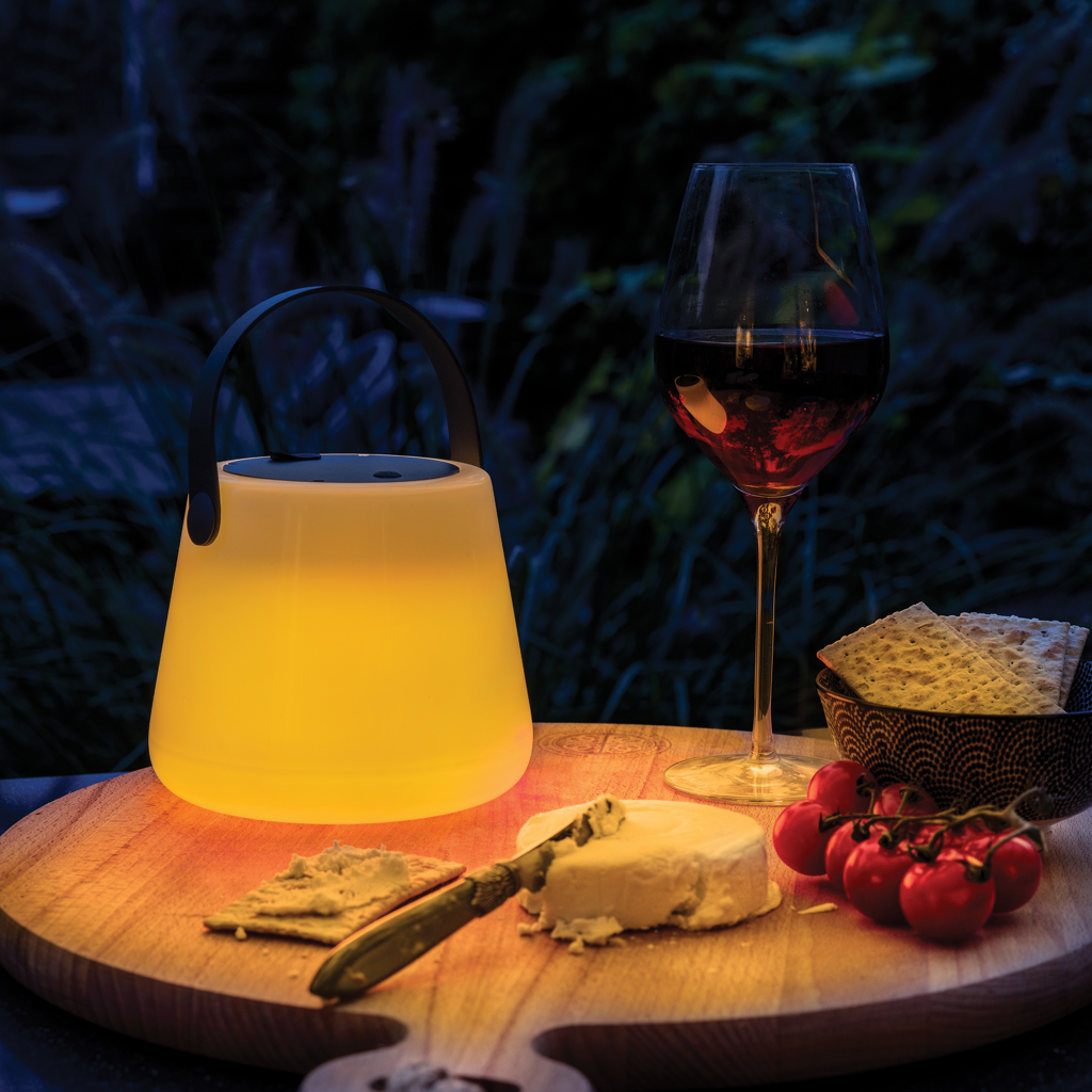 LED-Solartischleuchte aus RCS-zertifiziert recyceltem ABS. Gesamter recycelter Inhalt: 71% basierend auf dem Gesamtgewicht des Artikels. Die RCS-Zertifizierung gewährleistet eine vollständig zertifizierte Lieferkette für die recycelten Materialien. Die Taschenlampe verwendet eine wiederaufladbare A-Grade Lithiumbatterie mit 1200 mAh, so dass die Batterien nicht ausgetauscht werden müssen. Einfach über die USB-Buchse und den integrierten Type-C-Anschluss aufladen. Inklusive 80cm langem Ladekabel. Aufladezeit über Kabel: ca. 3 Stunden. 10 Stunden in hellem Sonnenlicht ergeben bis zu 3-4 Stunden Betriebszeit. Betriebszeit bei voller Ladung: ca. 20 Stunden. IPX 4 wasserdicht.