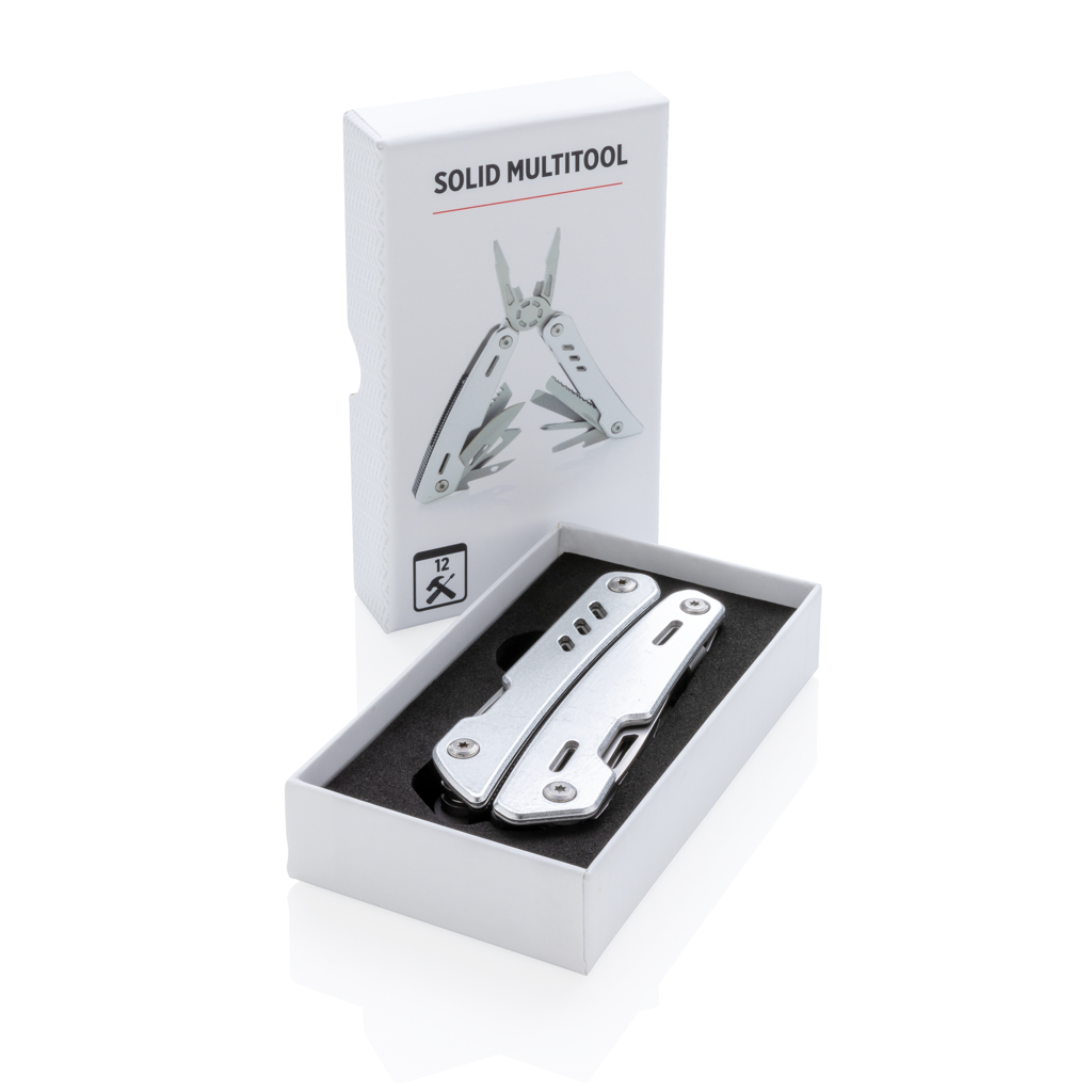 Multitool im Aluminium-Case mit 12 Funktionen aus Stainless Steel wie eine Feile, Zange, Messer, Schraubendreher, Säge, Dosenöffner und vielem mehr. In Geschenkbox verpackt.