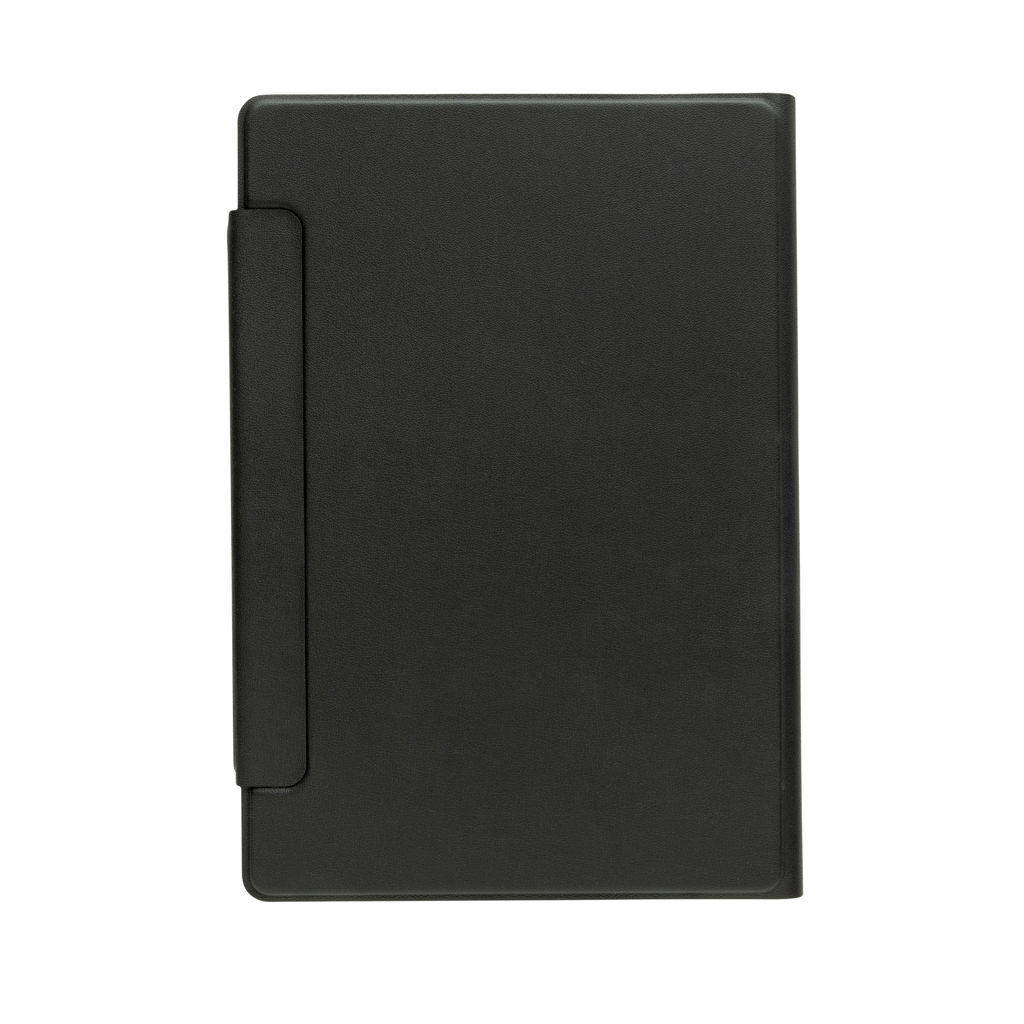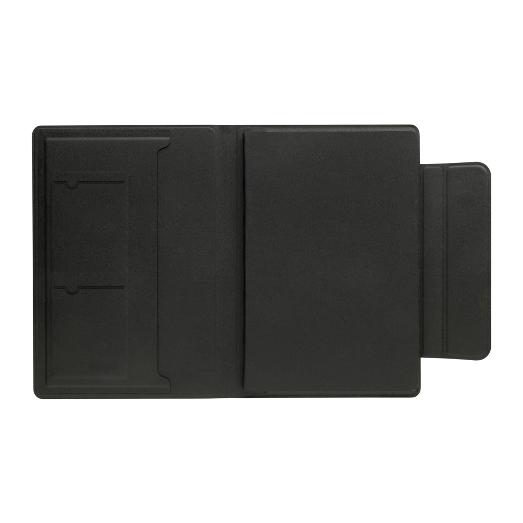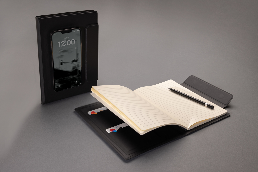 A5-Portfolio aus recyceltem PU mit Magnetverschluss und magnetischer Handyhalterung, die mit magsafe ( iPhones 12 oder höher) kompatibel ist. Das linierte A5-Notizbuch hat FSC®-zertifizierte 64 Blatt/128 Seiten cremefarbenes Papier; Papiergewicht 80g/m². Mit Dokumentenfach und 2 Visitenkartenfächer. Das Notizbuch ist nachfüllbar.